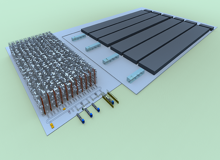 光伏產業在最近幾年時間里得到飛速發展,可分為光伏原材料如多晶硅、玻璃等以及光伏組件。大多數光伏產品是以整托形式出入庫,其重量較重,尺寸較大,且存儲量一般較大,給自動化物流設備帶來一定的挑戰。